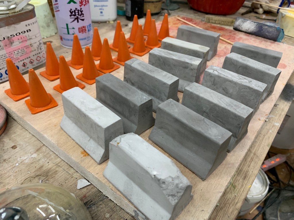 實體麵包製模、翻模及三角錐、紐澤西護欄之道具模型製作。